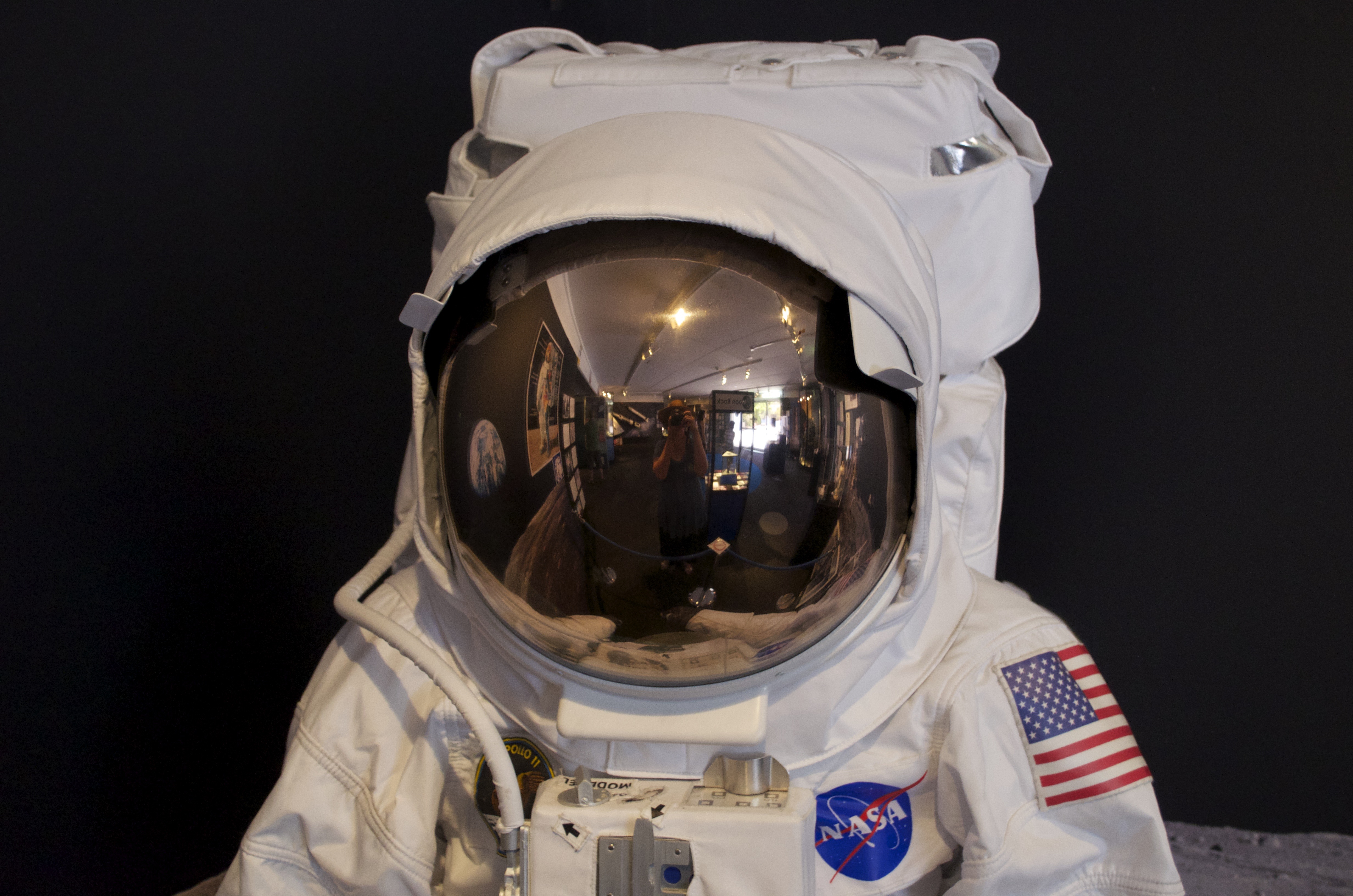A picture of a a space suit with the authors reflection in the face shield, taking the photo