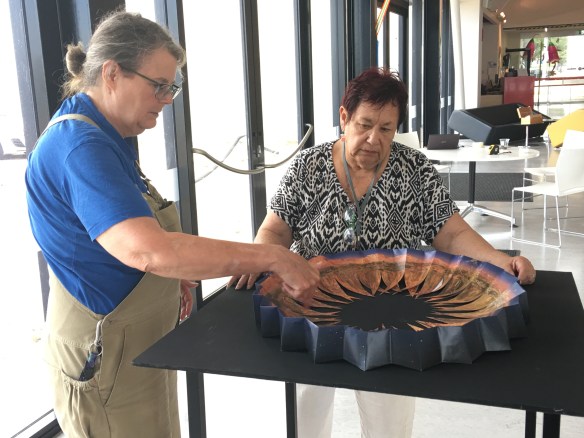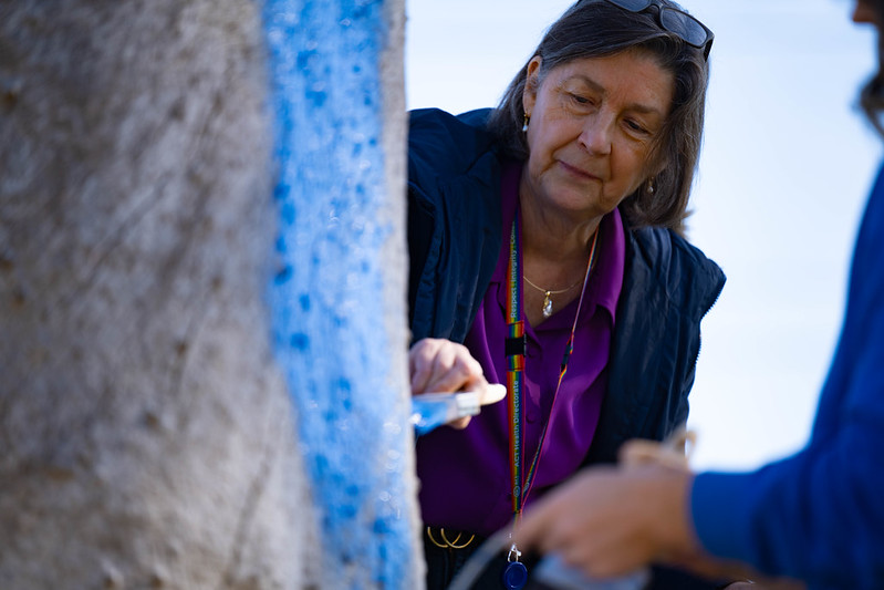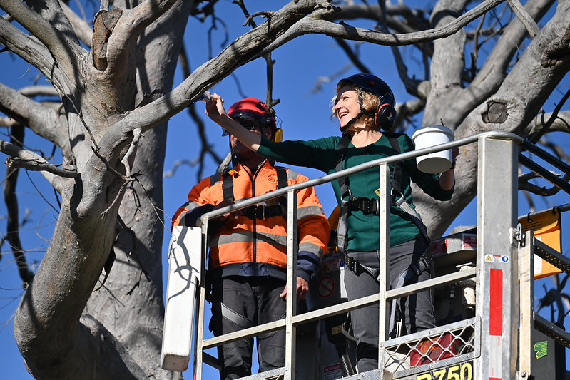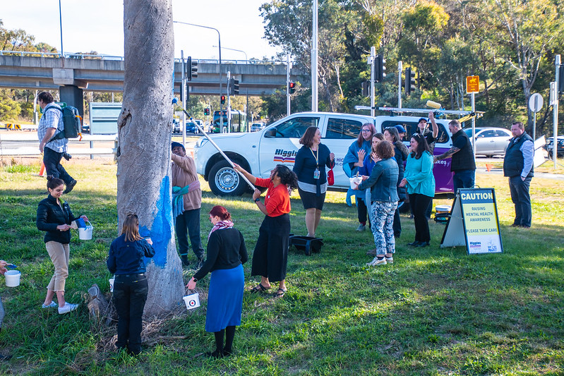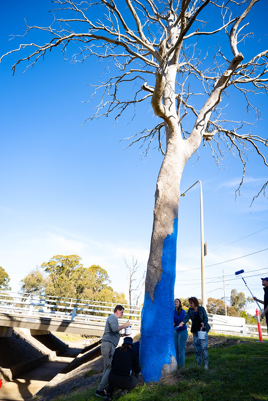 Samantha Ning from TCCS Directorate was a driving force behind the blue tree being painted in Lyons, working with ACT Health, and Kendall Whyte. It has been years in the organising; El Nino and a pandemic intervening. Kendall Whyte spoke at the painting ceremony, and I at last met her in person and we hugged. I was honoured to meet Aunty Lydia George. And I was blessed to meet all the gentle people from the community and from government in the Australian Capital Territory who have worked together to get a very big tree painted blue on Hindmarsh Drive where so many people can wonder over it, and maybe start a difficult conversation. It has to be better than silence. And to my astonishment I read, at the invitation of Gabrielle Mulcahy, my poem to Minister Emma Davidson, on the following Thursday when she got up in the ‘The Tower,’ a crane or bucket lift, to paint the upper branches, followed by the TCCS Tree Protection team who finished off the job by spraying those top limbs and twigs.